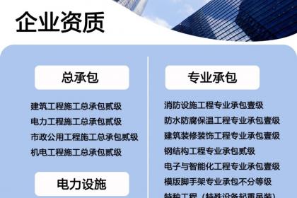 众电建设集团拥有丰富的资质资源,拥有电力施工总承包‌‌‌‌‌‌级,电子与智能化工程专业承包壹级、消防设施工程专业承包壹级、防水防腐保温工程专业承包壹级、建筑装修装饰工程专业承包壹级、建筑工程施工总承包贰级、电力工程施工总承包贰级、市政公用工程施工总承包贰级、机电工程施工总承包贰级、钢结构工程专业承包贰级、施工劳务不分等级、模板脚手架专业承包不分等级、特种工程(特殊设备起重吊装)专业承包不分等级同时具有电力承装级承修级承试 ,希望与有实力的伙伴开展战略合作,实现优势互补,资源共享。能够帮助您增强企业的核心竞争力,满足业主对工程项目的 要求。能够协助您搞好工程项目运作,提高工程项目的中标率和成功率。